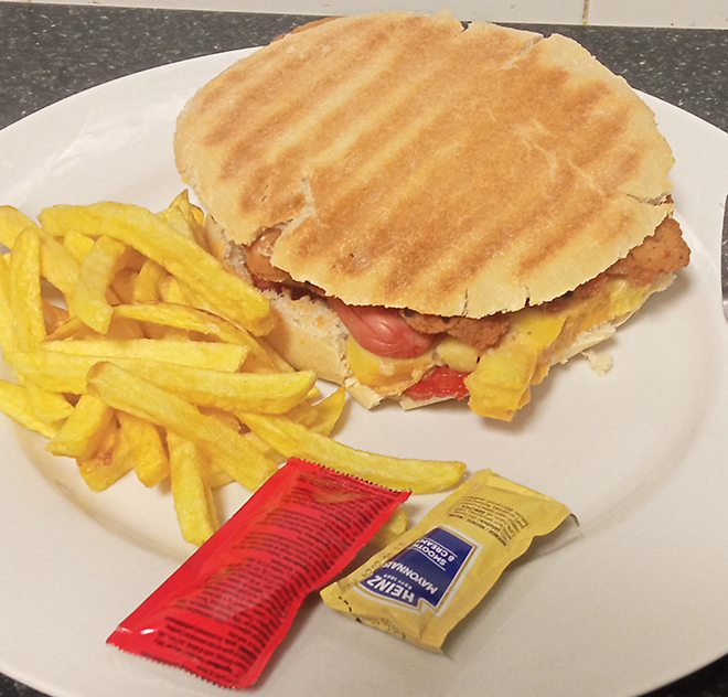 Tomate en rodajas, Filetes de pollo o cerdo, Huevo frito, Salsa Mahonesa, Salsa Gaucha y Lechuga